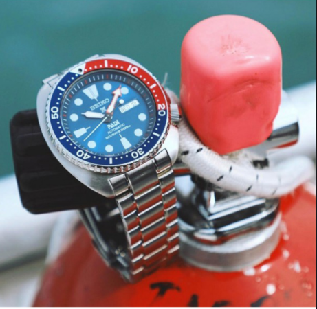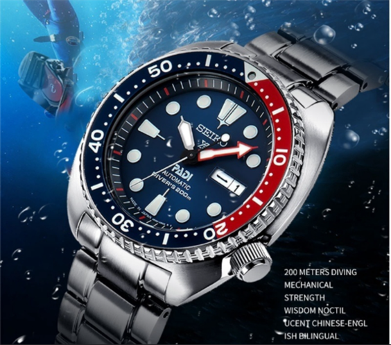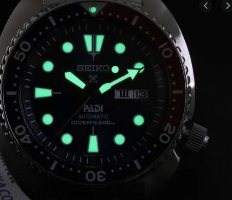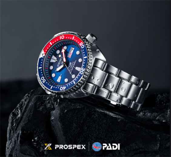 Orologio subacqueo professionale. Movimento a carica automatica con opzione carica manuale 4R36. tre sfere, giorno data, frequenza 21600 alternanze/ora, 24 rubini, riserva di carica di oltre 41 ore. Corona e fondello a vite W.R 200metri, ghiera girevole unidirezionale con trattamento IP. blu e rosso. Indici e sfere con trattamento LUMIBRITE per visione al buio. EDIZIONE SPECIALE PADI CON ASTUCCIO DEDICATO. Vetro Hardlex, doppia chiusura con sicurezza e possibilità allungo per indosso su muta sub.